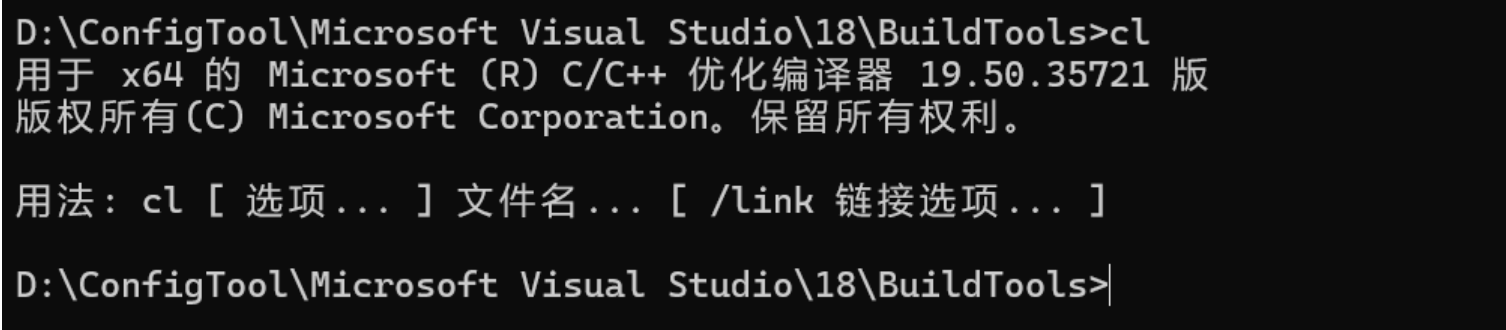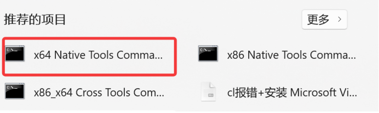 4.安装完成后,重启 PowerShell ,并使用 "x64 Native Tools Command Prompt" 启动终端(这样 cl.exe 才在 PATH 中)。