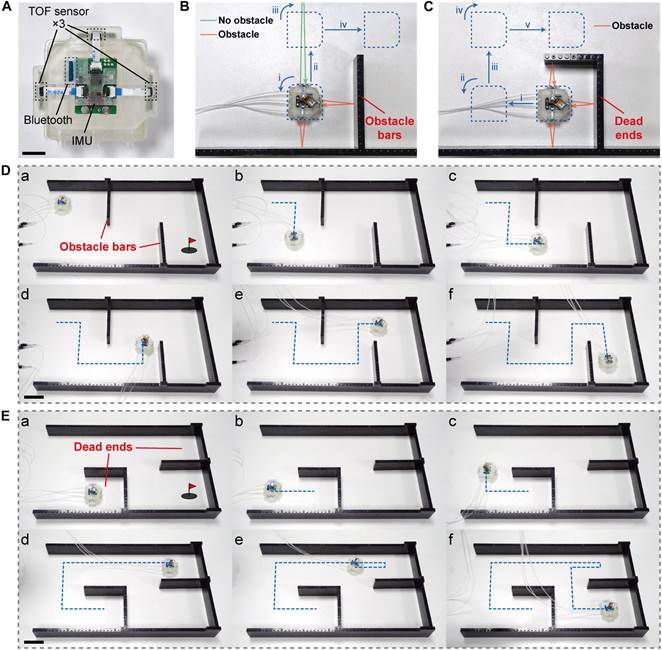 机器人搭载定制化微型 PCB,集成蓝牙模块、IMU 和 3 个飞行时间(TOF)传感器,可实时监测周围环境距离(阈值 60mm)。在 S 形迷宫和死胡同场景中,机器人能通过 IMU 追踪航向,结合 TOF 传感器数据自主规划路径,完成转向、倒退、绕行等动作,无需人工干预即可抵达目标位置。