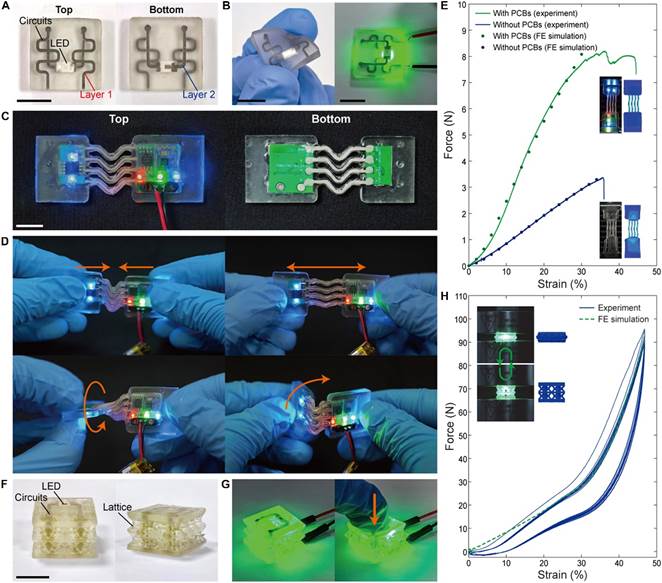 **抗变形结构设计:**通过晶格超材料、波浪形互连件和离散化 PCB 三大设计,让机器人在拉伸、压缩、扭转等大变形下仍保持机电稳定。离散化 PCB 减少应力集中,波浪形电路提升柔性,晶格结构可缓冲冲击,即使承受 40% 应变,内置 LED 电路仍能正常发光。