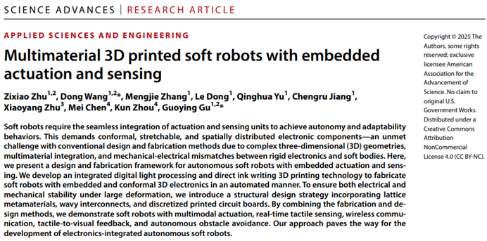 Zixiao Zhu et al. Multimaterial 3D printed soft robots with embedded actuation and sensing. Sci. Adv.11, eadz2928(2025).