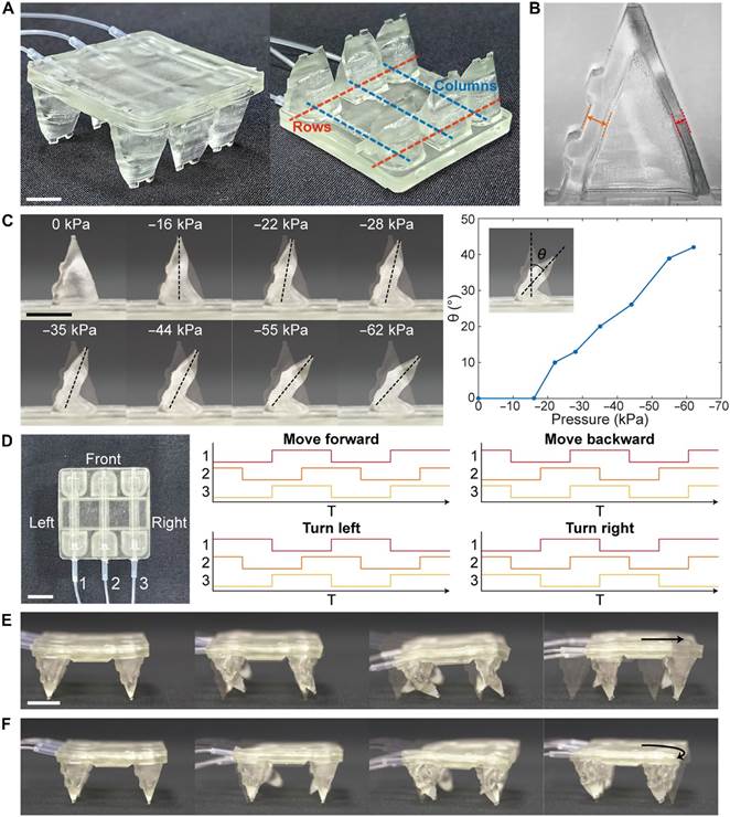 软执行器采用 2 行 3 列的足部设计,每个足部是厚度不对称的三角形结构(左壁 1.1mm、右壁 0.8mm),通过独立控制 3 个气动通道的负压信号,可实现前进、后退、左右转向等运动。当施加 - 62kPa 负压时,足部弯曲角度可达 45°,通过调控通道驱动时序,机器人能在平面自由移动。