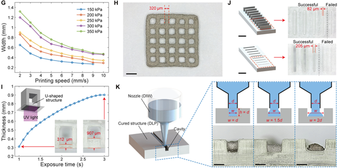 为解决 DLP 与 DIW 工艺的兼容性问题,引入气刀清除残留树脂,确保导电硅胶与 PCB 焊盘的可靠连接,当预留通道宽度与 DIW 喷嘴直径匹配时,可实现完全填充。