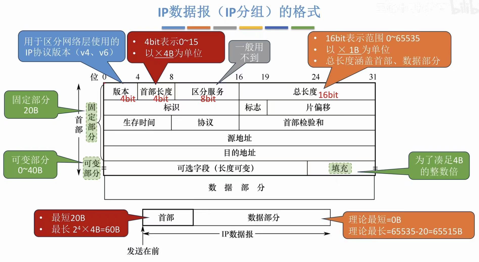 - 首部20~60B:可靠有连接,自然占的就大一点儿(因为要装好多东西,源地址目的地址blabla...)