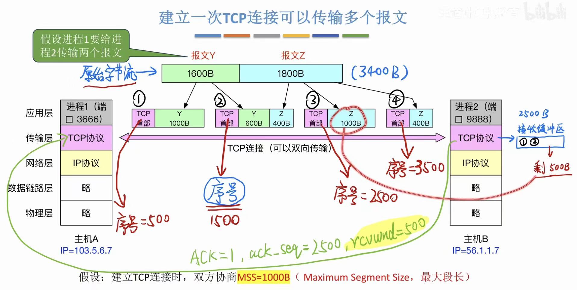 接收缓冲区已经接收了1、2也就是2000B,窗口设置的大小是2500B,所以就只剩500B的剩余空间,就不可能放得下3了。
