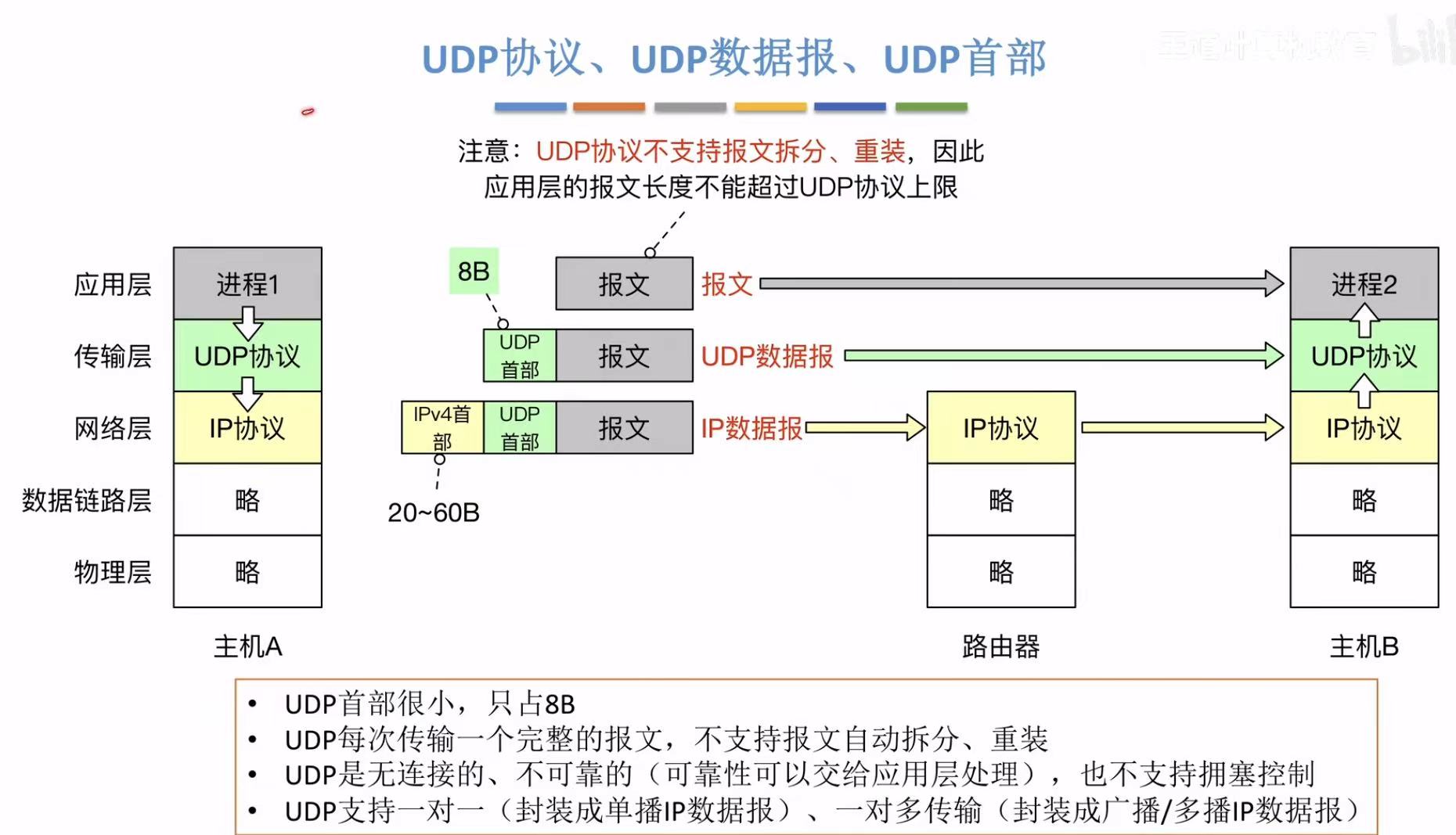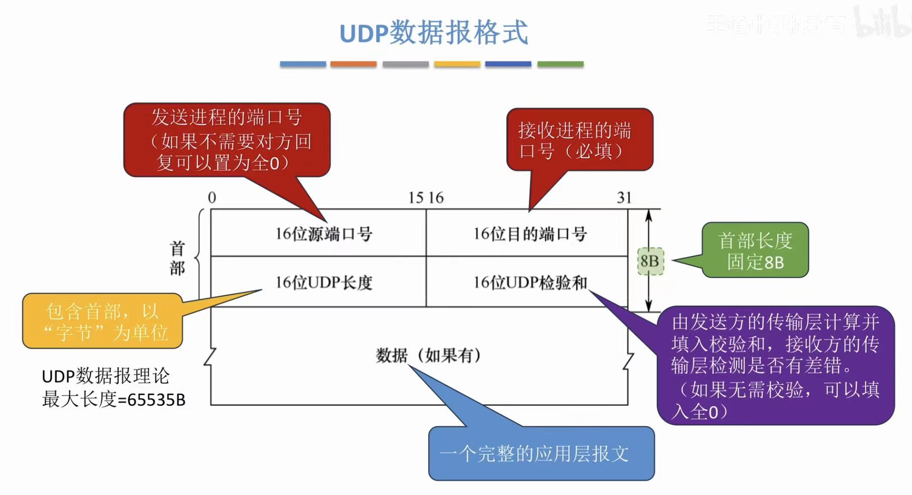 - 首部只有8B:毕竟都无连接不可靠传输了,也不可能装太多东西