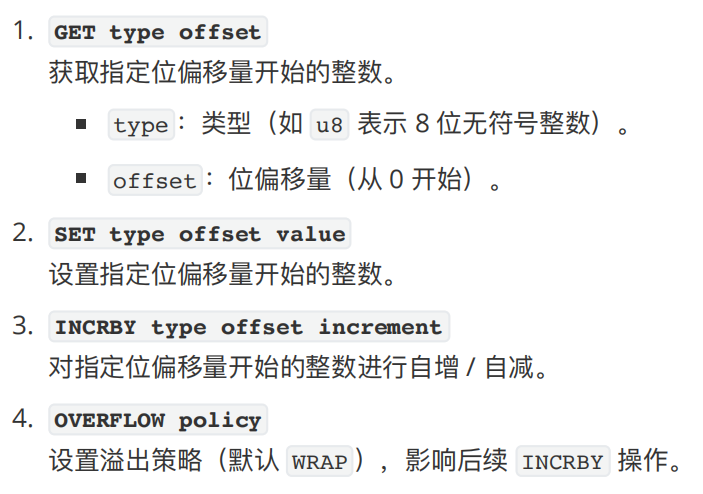 BITFIELD key [GET type offset] [SET type offset value] [INCRBY type offset increment]