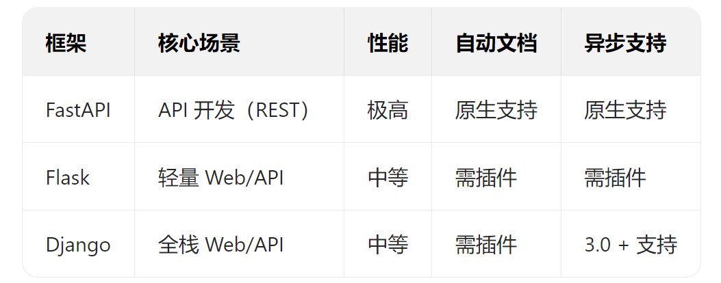 - 不选 FastAPI 的场景:需要完整的模板渲染、Admin 后台(优先 Django);极简小工具(优先 Flask)。