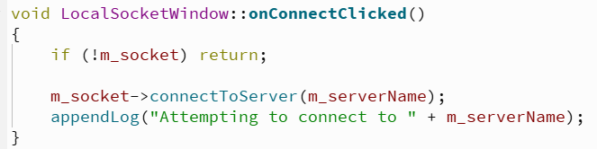 connect(m_connectButton, &QPushButton::clicked, this, &LocalSocketWindow::onConnectClicked);