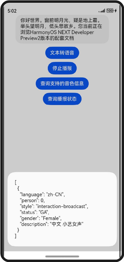 注意:HarmonyOS NEXT 当前 仅支持离线 TTS ,且 只有小艺女声音色。