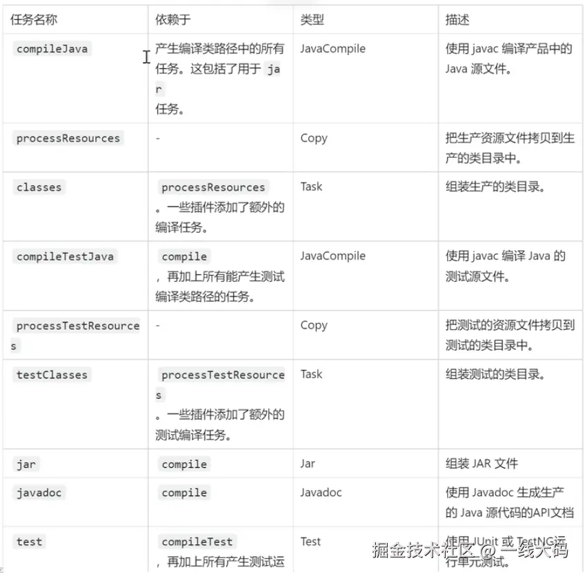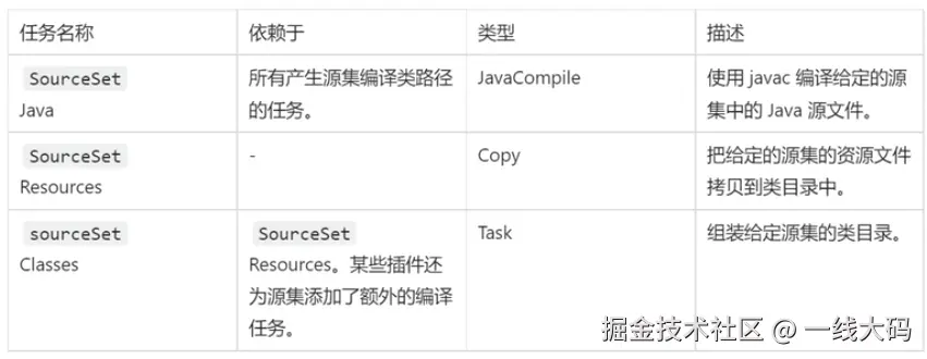 对于每个添加到该项目中的源集。Java插件将添加以下编译任务。