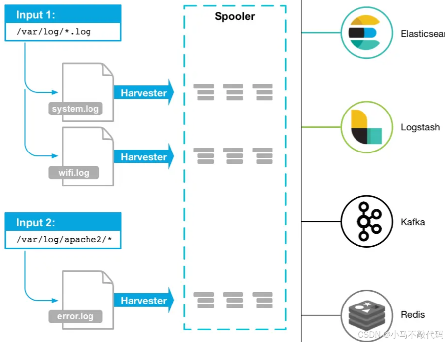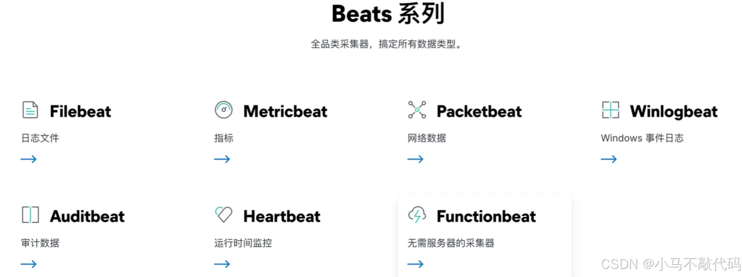 Elastic 其实提供了多个 Beat 来采集各种各样的日志、信息数据,我们把这些 Beats 称为 Beats 系列。官网上 Beats 系列现在包括以下几个: