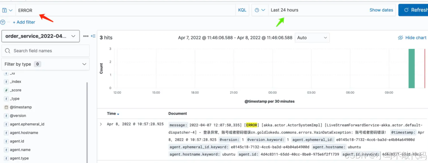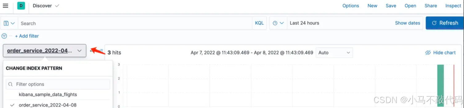 如上图,点击箭头处选择我们需要查看的日志数据索引即可。此时我们可以在 Kiaban 进行日志搜索: