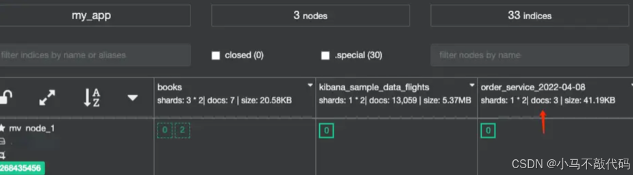 如上指令,你需要修改 OrderService.log 的文件路径,并且与 filebeat.inputs 指定监听的文件一致。日志推送后,可以在 cerebr 中可以看到新创建的索引 order_service_${date}: