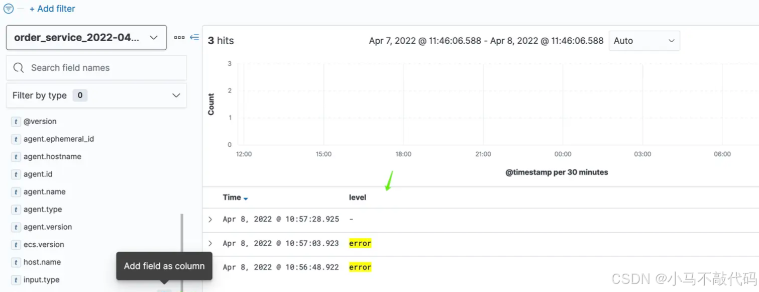 如上图,这里需要选择 @timestamp,这样可以方便在 Kibana 中做日期筛选。完成 pattern 创建后,点击 Kibana 左边菜单栏的 Analytics 下的 Discover: