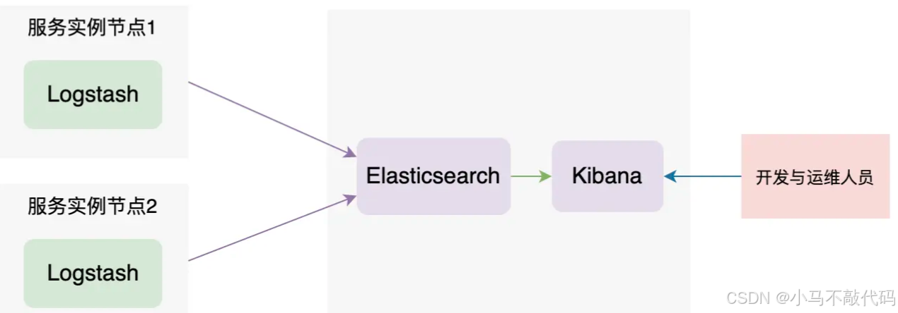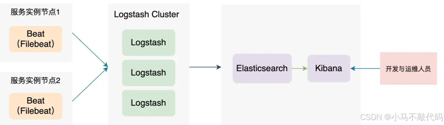 如上图,这是一种非常简单的架构,需要维护的组件少,安装搭建都比较简单,用 Logstash 直接采集服务的日志,然后储存到 ES 中即可。但缺点也是比较明显的,每个服务实例的节点上都需要安装 Logstash,需要消耗的资源比较大,有种用牛刀杀鸡的感觉。这种架构比较简单,是不足以支撑企业级业务运行的。