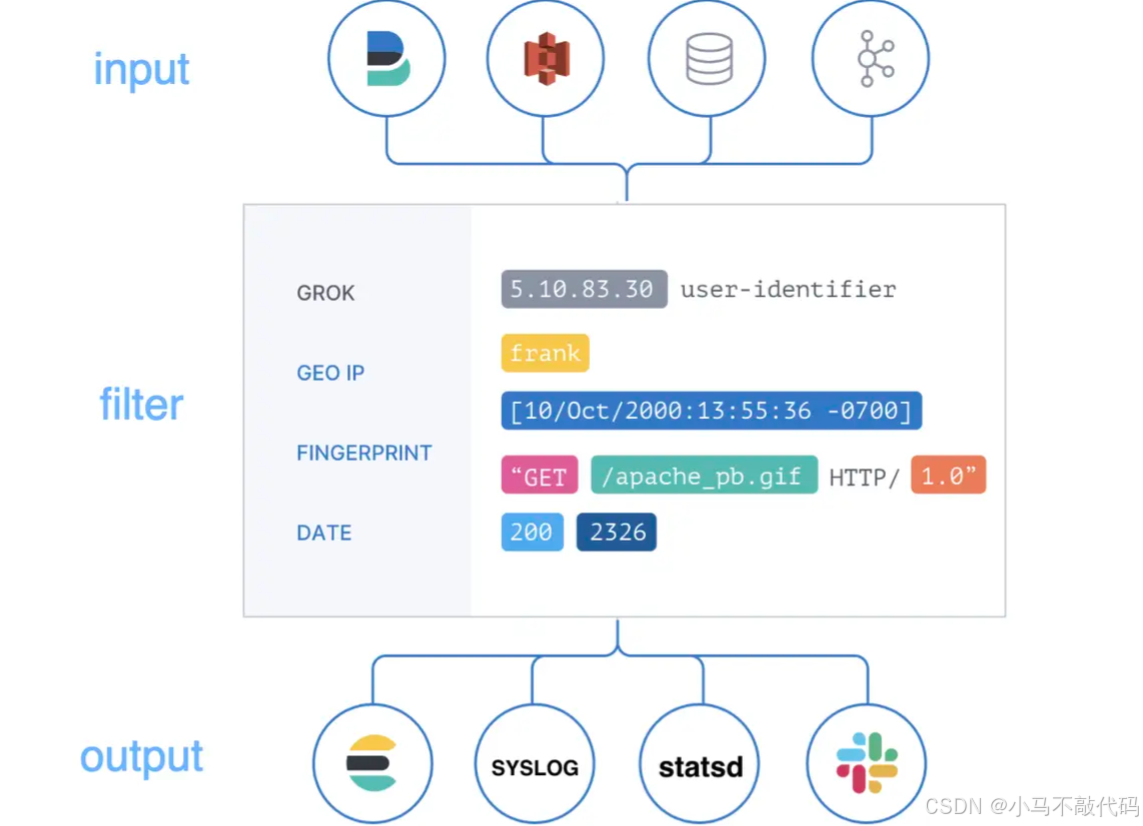 所以 Logstash 处理数据的整个流程为 input -- event --> filterevent -- event --> output ,其中 input、filter、output、event 概念的解析如下: