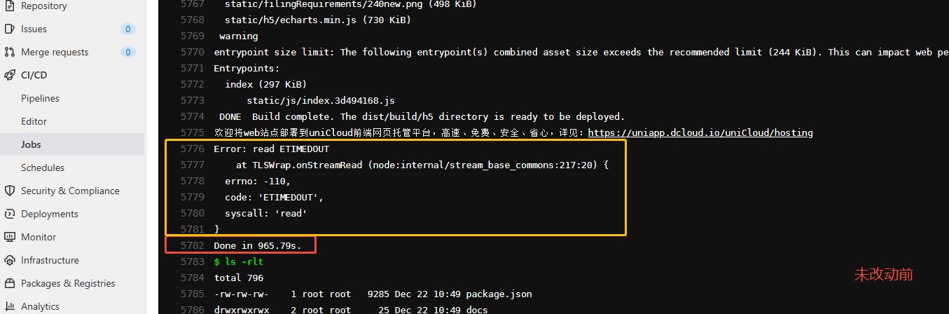 接着就可以在构建时候查看ci/cd日志,分析是哪些外网请求超时了,还是本地文件访问超时了。