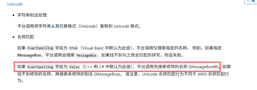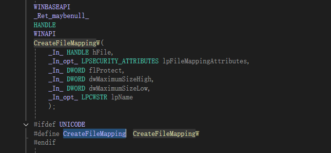 因为调用的时候指定了Unicode,所以在C#中才可以使用CreateFileMapping而不是CreateFileMappingW。