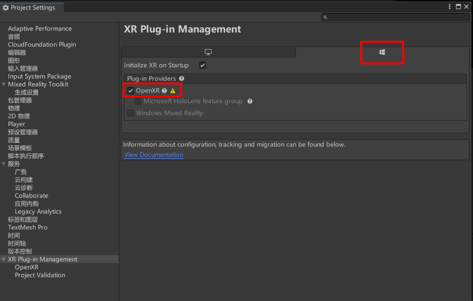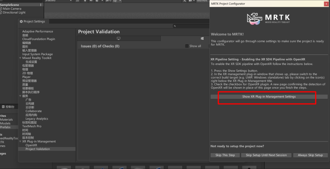 3.点击配置器中的「Show XR Plug-in Management Settings」按钮,会自动跳转到 XR 插件管理的设置界面