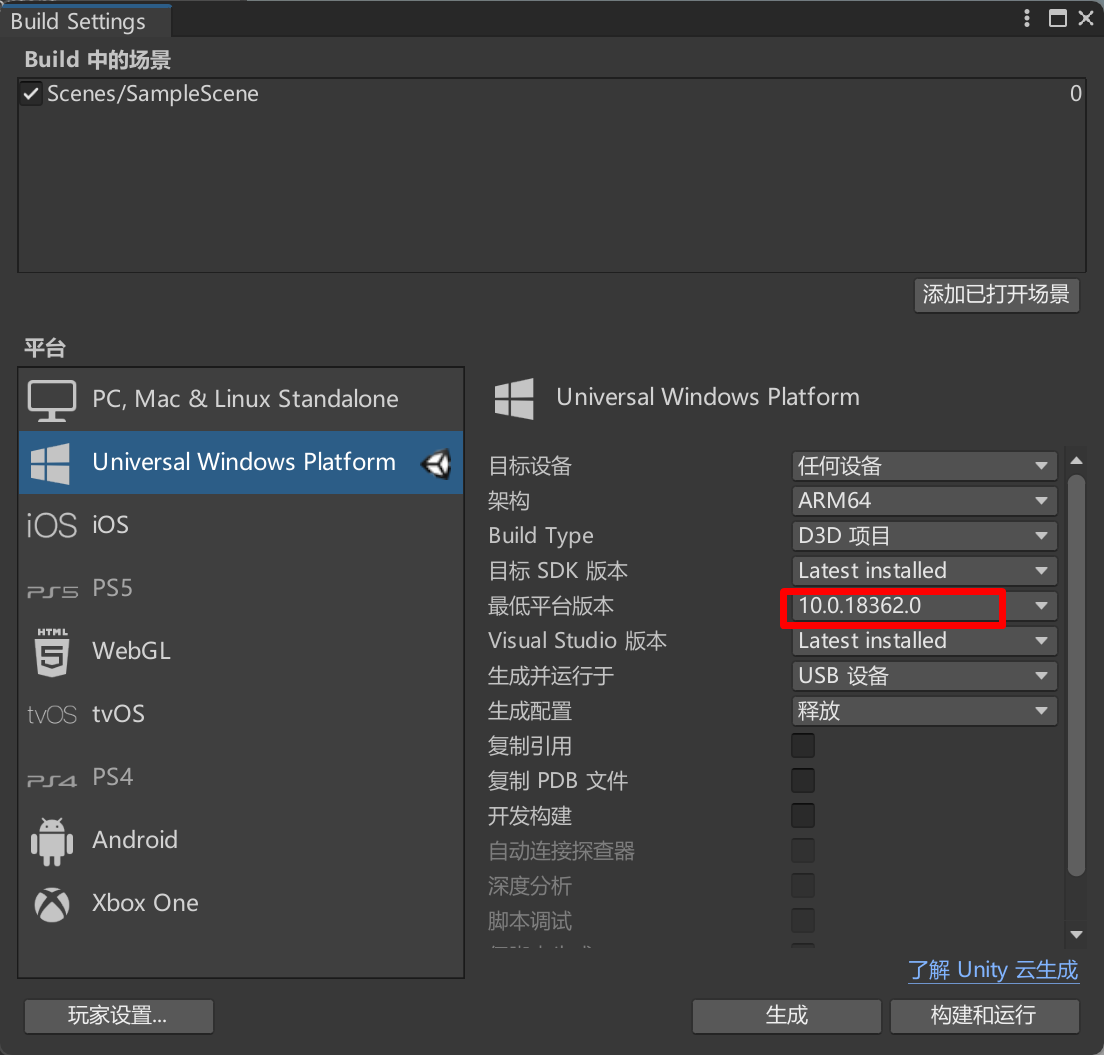 7.菜单栏「文件」→「生成设置」,切换到「通用 Windows 平台」标签,在构建设置界面中,找到「SDK 版本」区域:「最低 SDK 版本」选择为10.0.18362.0