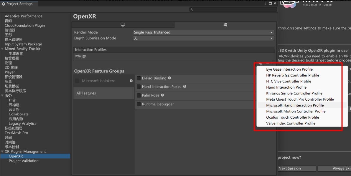 5.点击左侧的「OpenXR」选项(在 XR Plug-in Management 下面),进入 OpenXR 设置后,找到「Interaction Profiles」,点击「+」号,添加「Microsoft HoloLens 2 Profile」(这是 HoloLens 2 的手势、凝视等交互的配置文件)