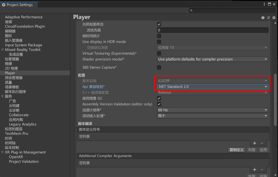 脚本后端:选择「IL2CPP」(HoloLens 2 必须);