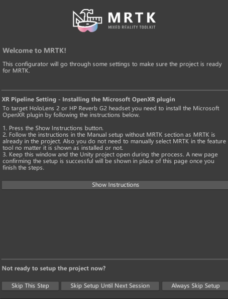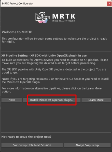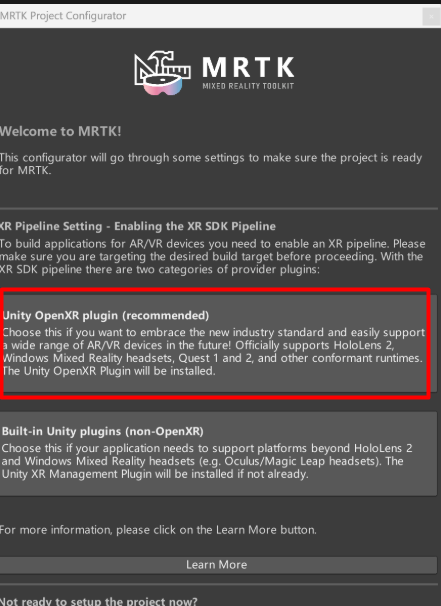1.点击「Unity OpenXR plugin (recommended)」选项(灰色卡片),配置器会自动安装 OpenXR 插件,并启用适配 HoloLens 2 的 XR 管线