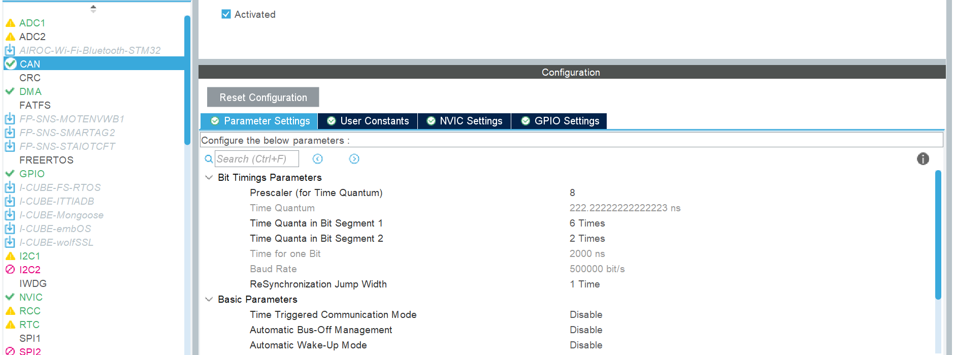 然后将相应的路径添加到工程里面即可,然后再cubemx中进行can控制器的配置,如下: