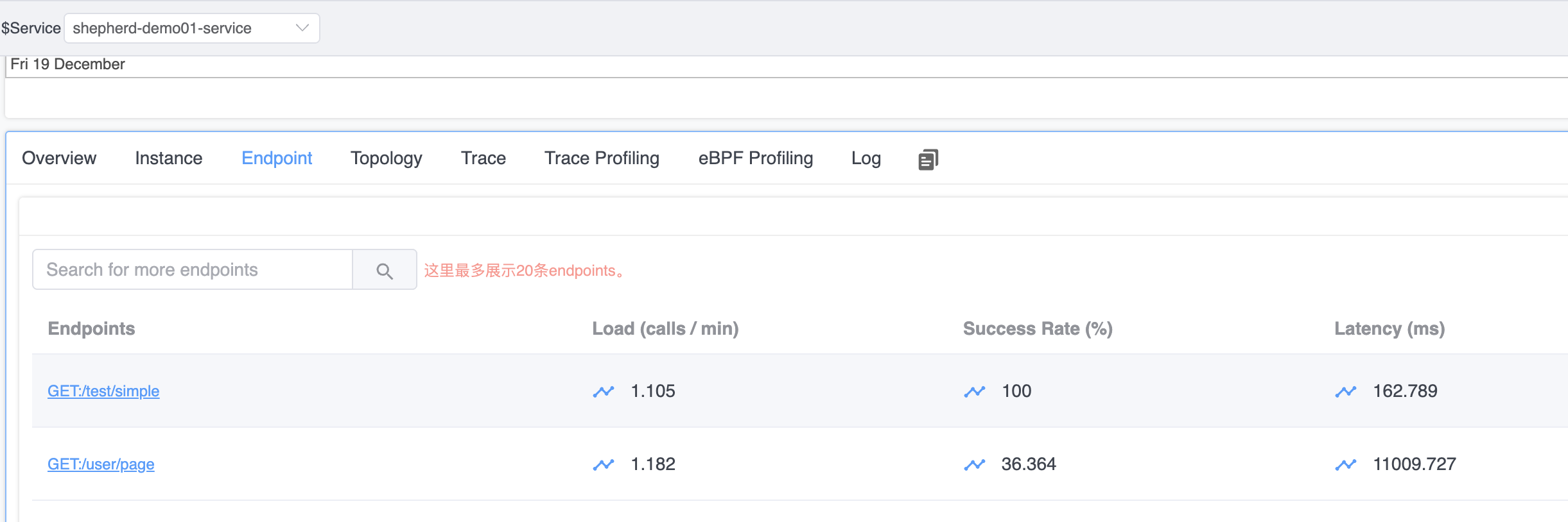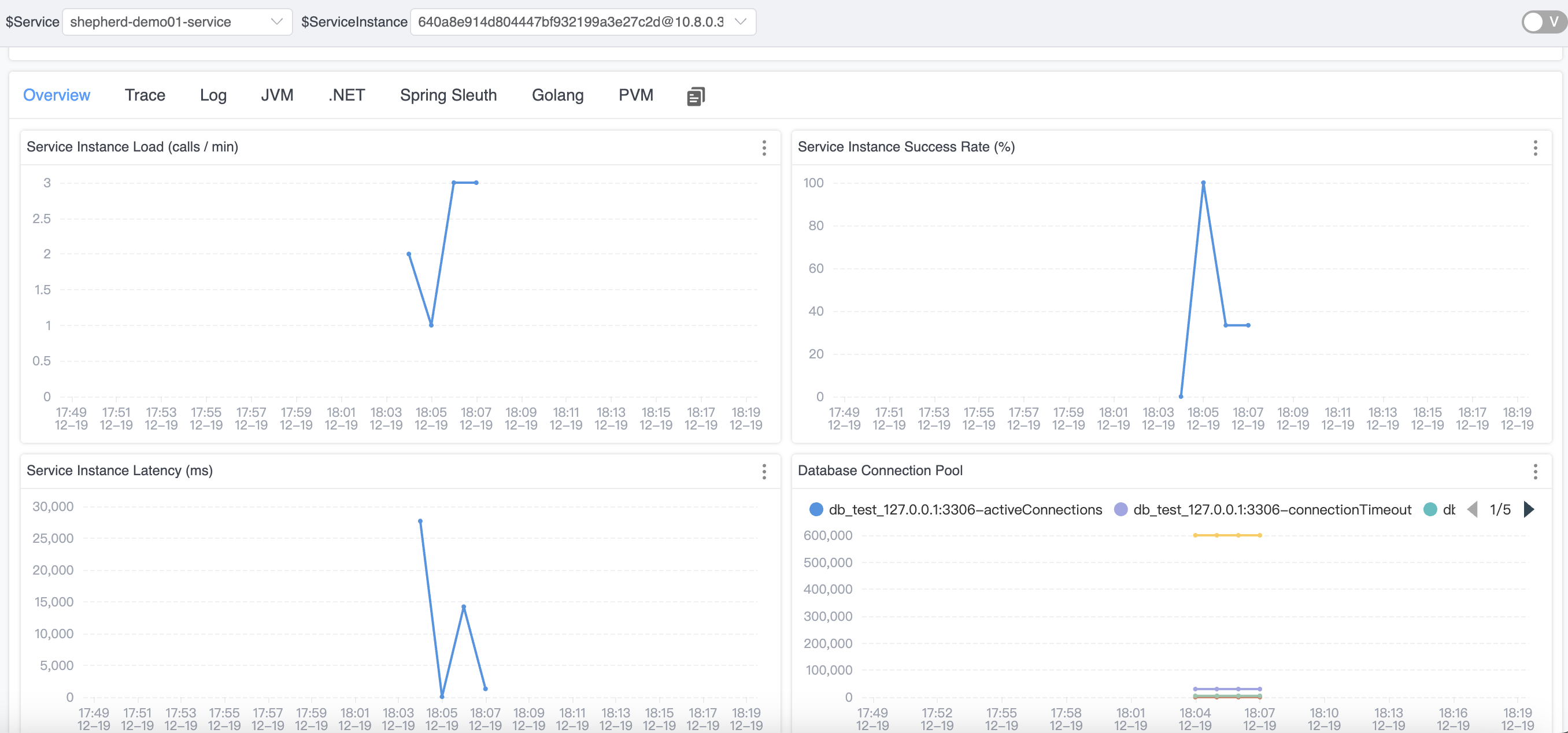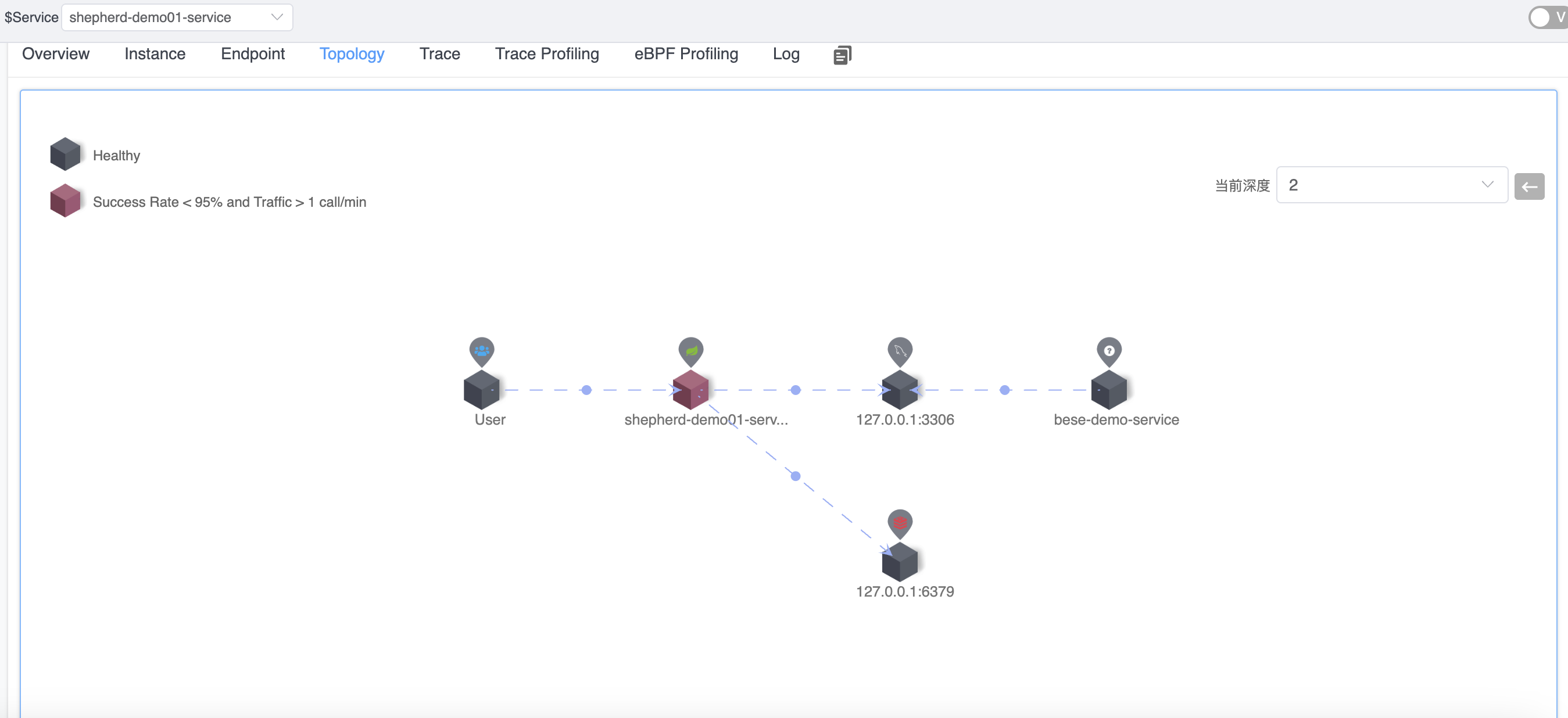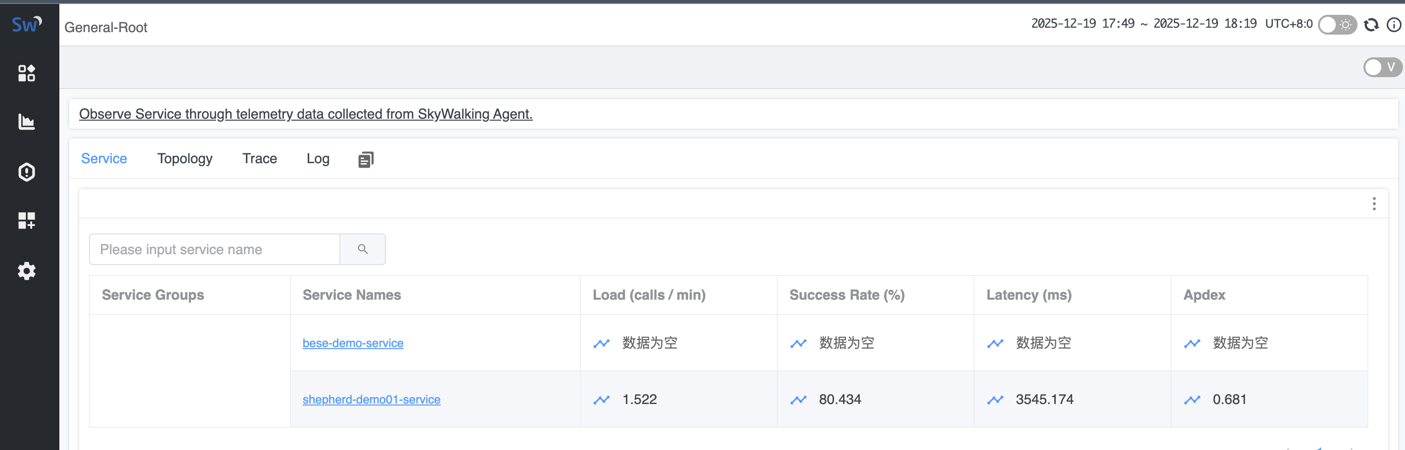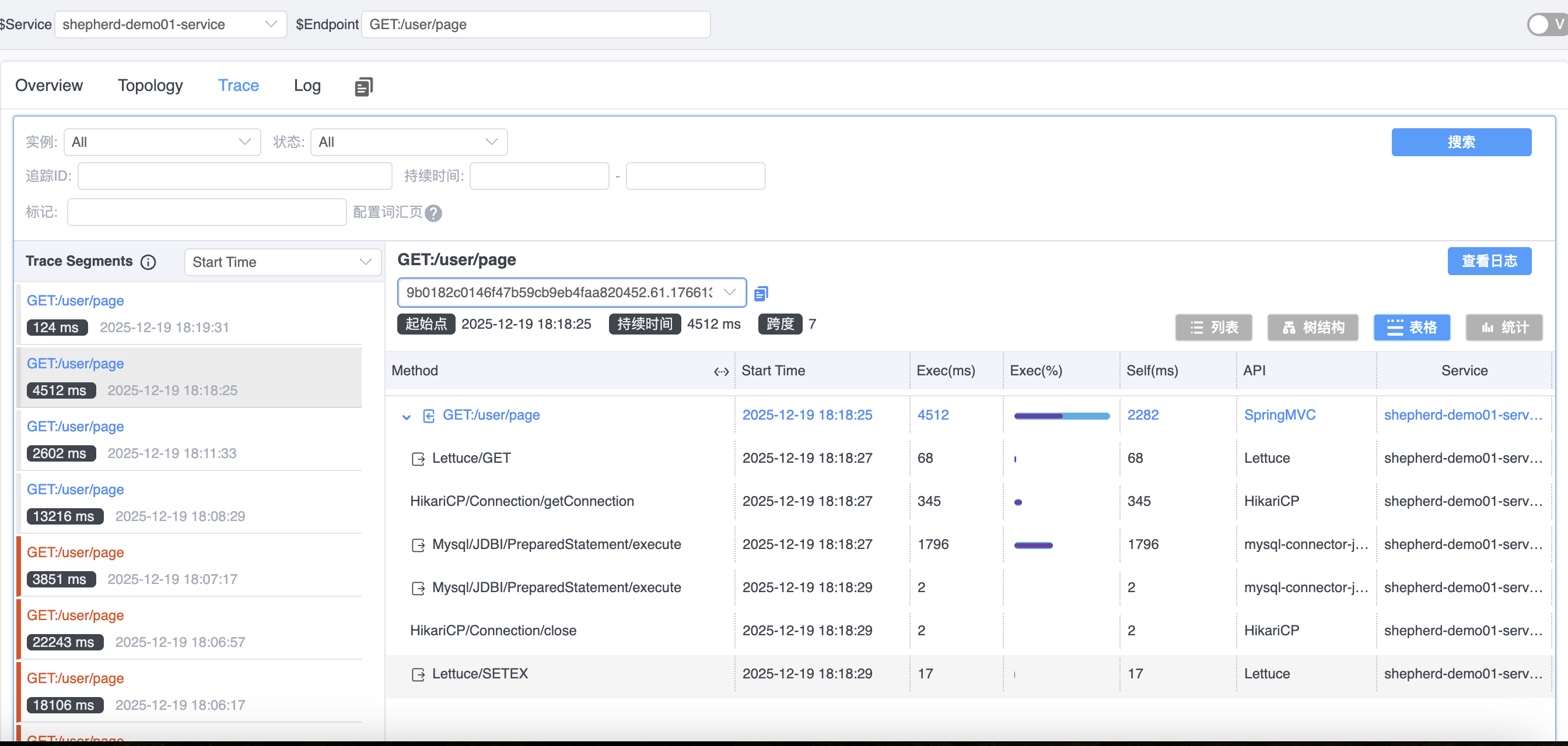 项目启动成功之后,Skywalking会监控到一个名为shepherd-demo01-service的服务,如上图所示。可看到对应的服务名称、实例、接口调用链路等信息