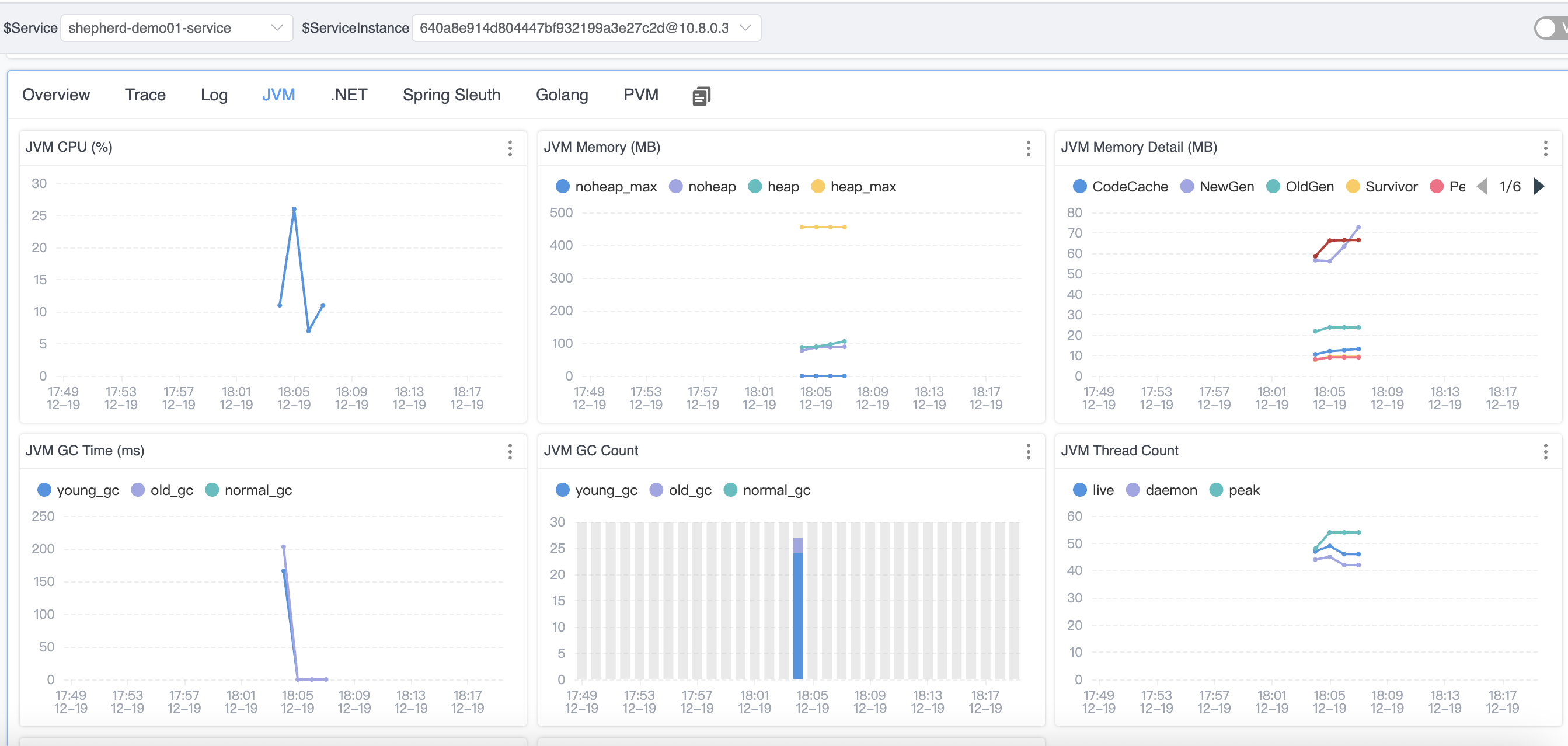- 实例详情:查看实例下的监控指标信息,如JVM内存、CPU、GC等情况