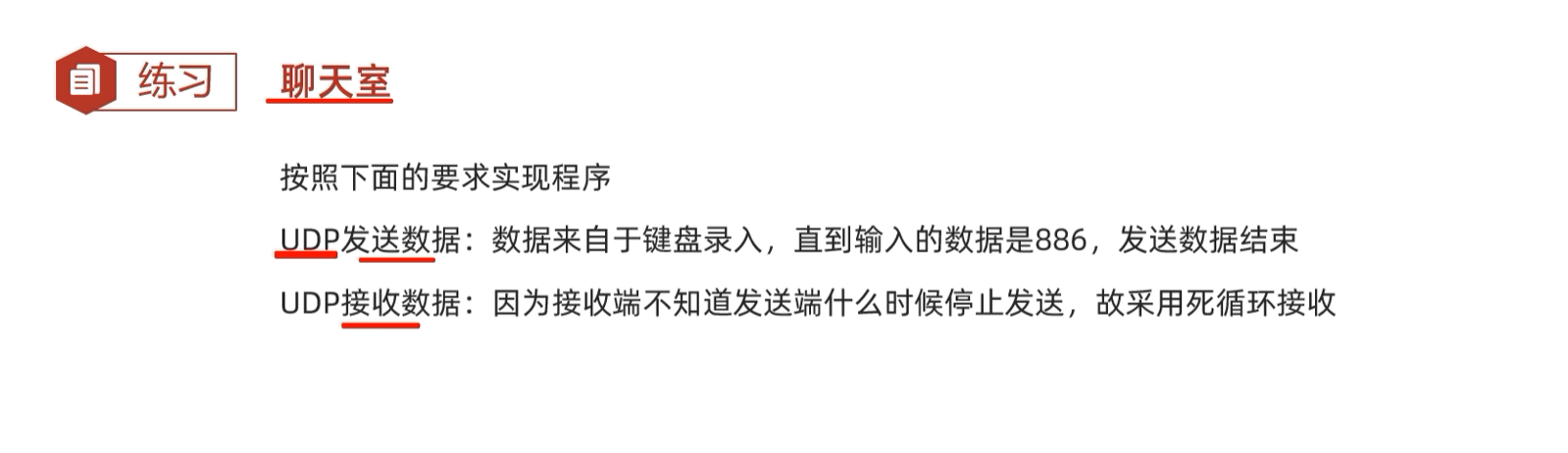 UDP接收数据: 因为接收端不知道发送端什么时候停止发送,故采用死循环
