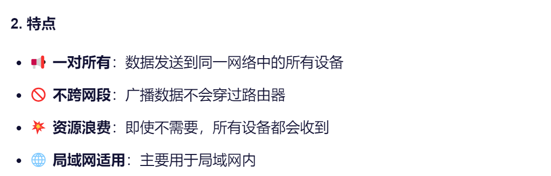 广播是一种一对所有的通信方式,数据从一个发送方发送到同一网络中的所有设备。