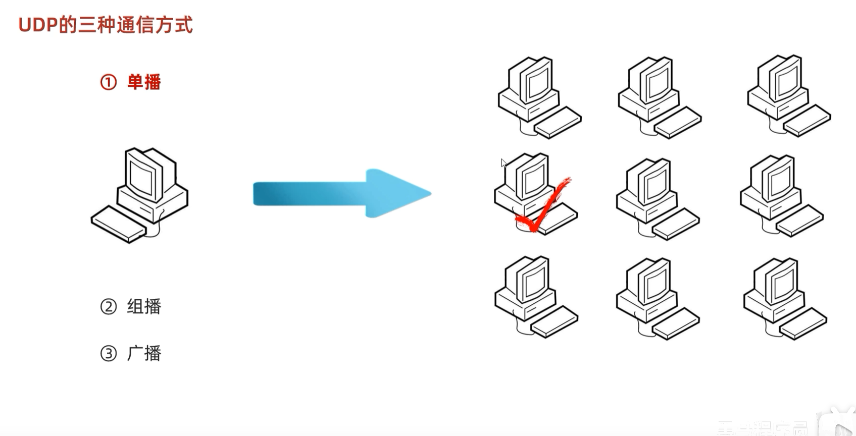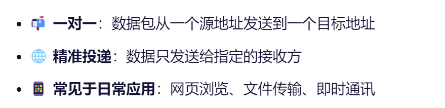 单播是最常见的通信方式,一对一通信。数据从一个发送方发送到一个特定的接收者。