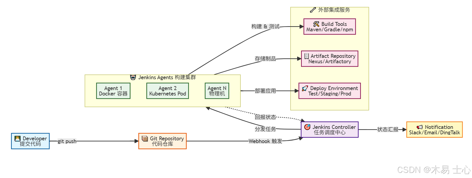 - 通知:Git 仓库通过 Webhook 通知 Jenkins Controller 有新的代码变更。