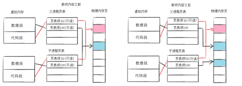 通常,父子代码共享,父子再不写入时,数据也是共享的,当任意一方试图写入,便以写时拷贝的方式各自一份副 本。具体见下图: