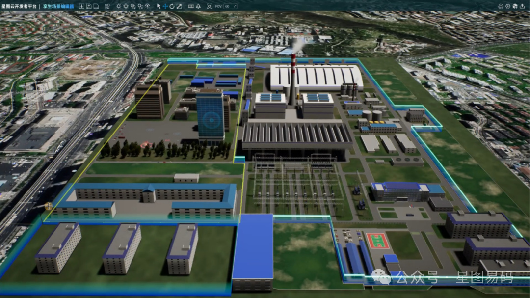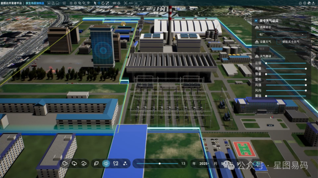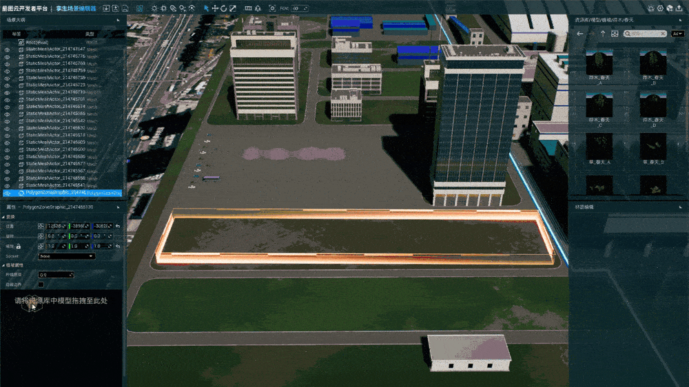 为此,星图云开发者平台推出「孪生场景编辑器」,以全流程、零门槛的一站式解决方案,重塑三维场景构建方式。用户可直接调用内置模型库或导入既有工业资产,通过积木式拖拽操作快速配置孪生场景;借助程序化生成技术,一键生成植被种植、车流模拟等动态场景;更可以在统一的环境拟真系统界面中实时调整材质、灯光、雨雪天气等特效,所见即所得。无需专业建模知识,用户便可高效搭建高保真三维场景,真实还原物理环境细节,将原本数周的工作量压缩至小时级别,真正实现从设计到孪生呈现的敏捷交付。