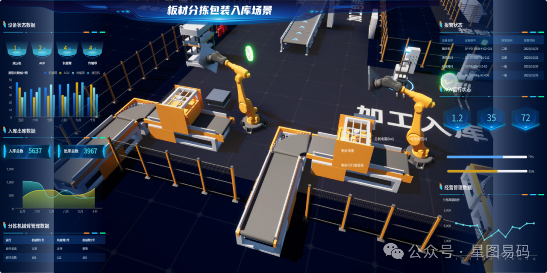 工业制造数字工厂:精准还原生产线设备布局,模拟设备运行状态与物料流转,支持故障设备高亮告警与维修路径规划。