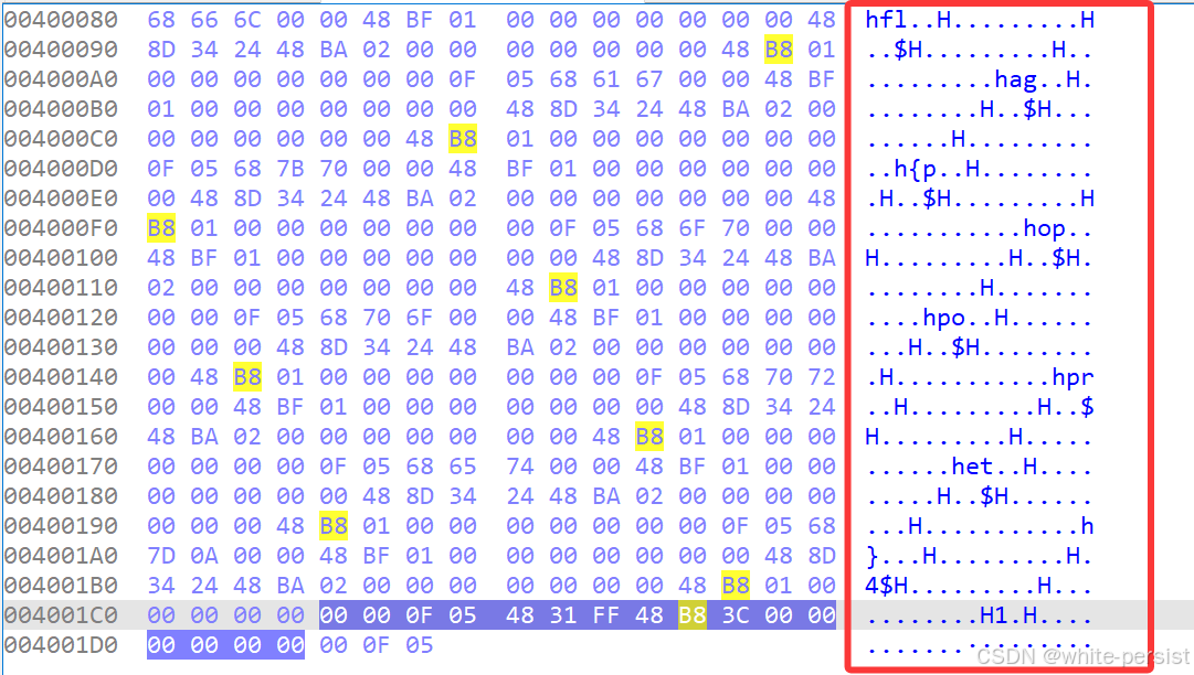 flag{xxx}格式; - 静态字符的无序性 :十六进制视图中的字符是机器码指令的一部分,而非直接的字符串常量,其在文件中的物理顺序≠程序执行时的打印顺序。