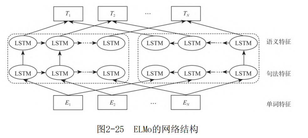 ELMo的预训练过程完成后,单词经过ELMo模型可以得到三层编码信息,Ei代表最底层的单词特征信息编码,从下往上第一层LSTM包含了句法特征的单词位置编码信息,第二层LSTM包含了语义特征的单词位置编码信息。