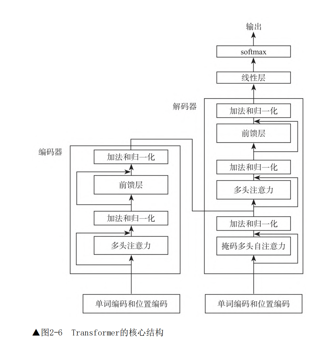 Transformer的核心结构由词嵌入、编码器、解码器、输出生成四个部分组成