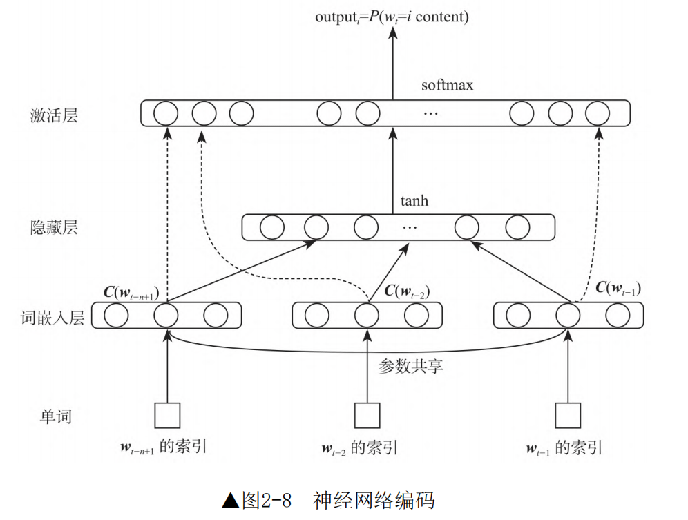 神经网络主要由三个部分组成:一个词嵌入层,用于生成词嵌入表示,且单词之间参数共享;一个或多个隐藏层,用于生成词嵌入的非线性关系;一个激活层,用于生成整个词汇表中每个单词的概率分布。