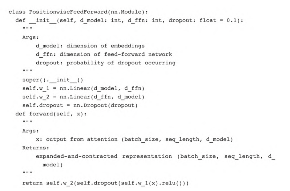 前馈层作为注意力层后面的子层,由两个线性层或致密层构成。第一层的大小为(d_model,d_ffn),第二层的大小为(d_ffn,d_model)。