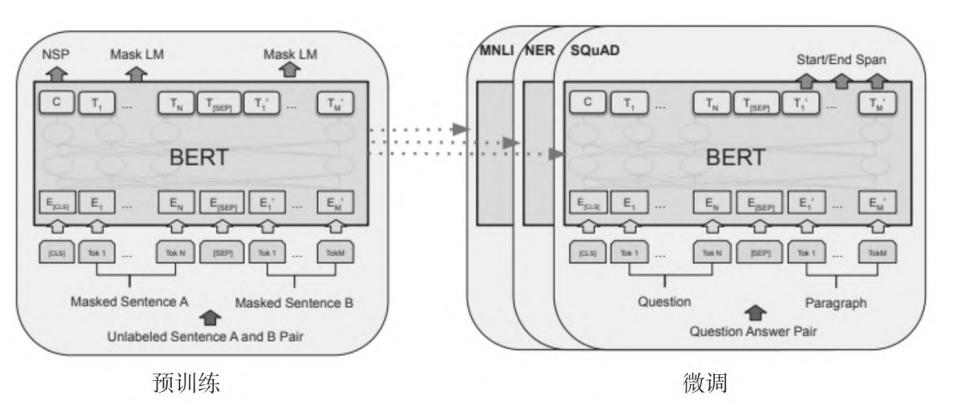过程中,所有的参数都会被微调。[CLS]是在每个输入示例前面添加的特殊符号,[SEP]是特殊的分隔符标记,如分割问题或答案。