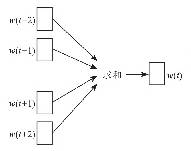 词袋模型又称为CBOW模型,它基于目标词前后的n个单词来预测目标单词。假设句子为:"她正在踢毽子",我们以"踢"作为目标词,取n=2,那么[正,在,毽,子]等前后单词及目标单词踢将