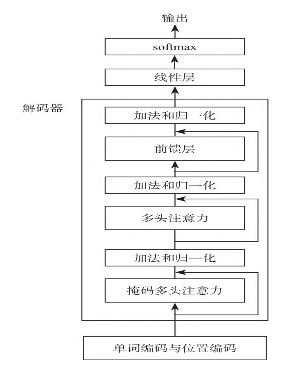 解码器也由多头注意力、加法和归一化、前馈层组成,每个解码器包含两层多头注意力,这两个多头注意力与编码器中的多头注意力作用不同。