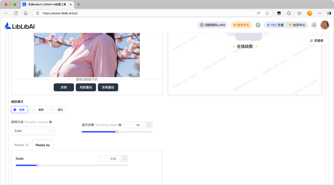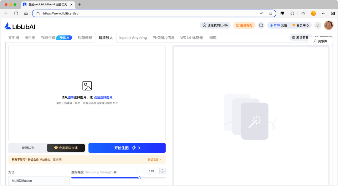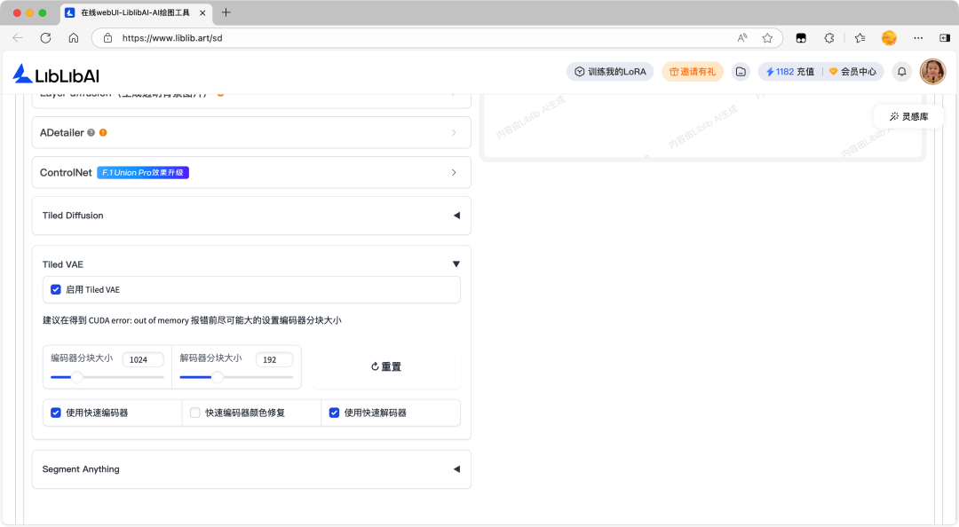 本地部署的 Stable Diffusion 需要自行安装 Tiled Diffusion 插件、Tiled VAE 插件,LiblibAI 已内置该插件,使用时需要注意部分检查点模型不支持使用 Tiled Diffusion 插件。