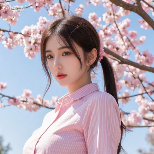 - 正向提示词(中文):一个女孩,独自一人,从下方视角,樱花,户外,棕色头发,白天,衬衫,写实风格,天空,棕色眼睛,蓝天,模糊,粉色衬衫,嘴唇,微张的嘴唇,条纹衬衫,上半身,向下看,条纹,树