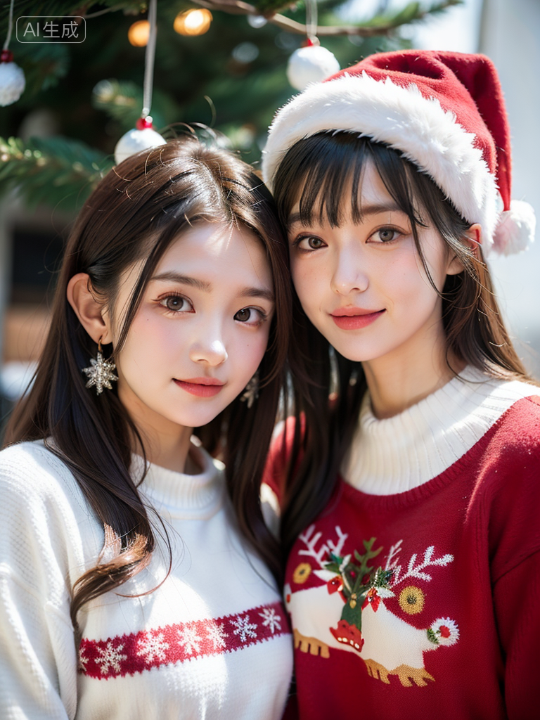 - 正向提示词(中文):两个穿着圣诞毛衣的可爱女孩,身处雪景之中,水彩画风格,在艺术网站上热门,焦点清晰,工作室照片,细节精致,高度写实