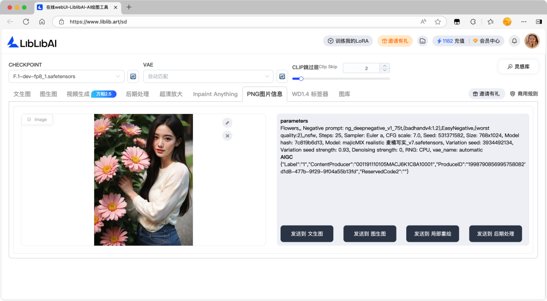 PNG 图片信息是核心实用功能,可以读取由 Stable Diffusion 平台生成的 PNG 图片中内嵌的生成元数据,快速复用这些参数到其他功能模块,不管是复刻自己的作品,还是学习他人的创作参数都很便捷。