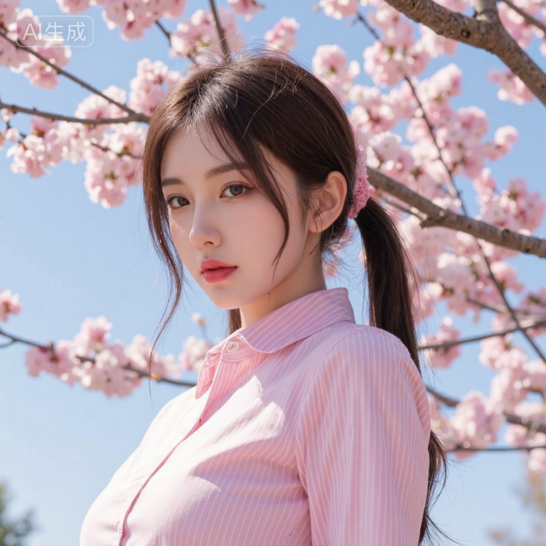 - 正向提示词(英文):1girl, solo, from below, cherry blossoms, outdoors, brown hair, day, shirt, realistic, sky, brown eyes, blue sky, blurry, pink shirt, lips, parted lips, striped shirt, upper body, looking down, striped, tree